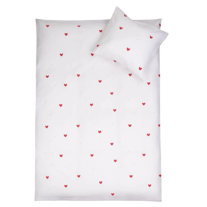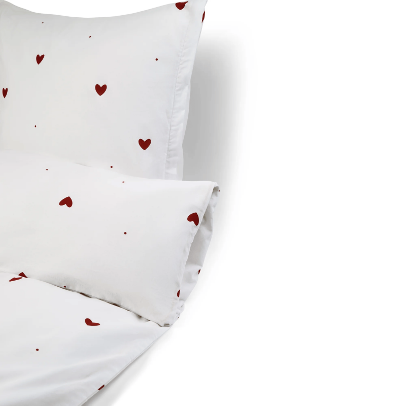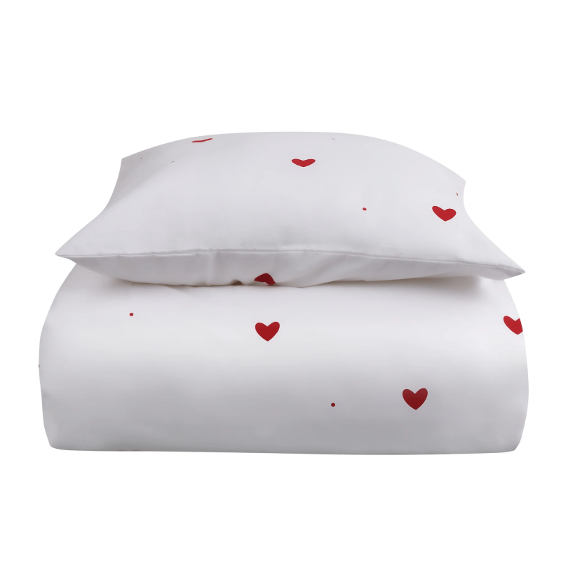Baby sengetøj 100% bomuld - 70x100 cm - Hvidt sengesæt med fine røde hjerter - Nordstrand Home blødt dynebetræk