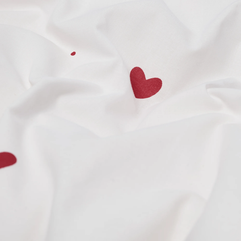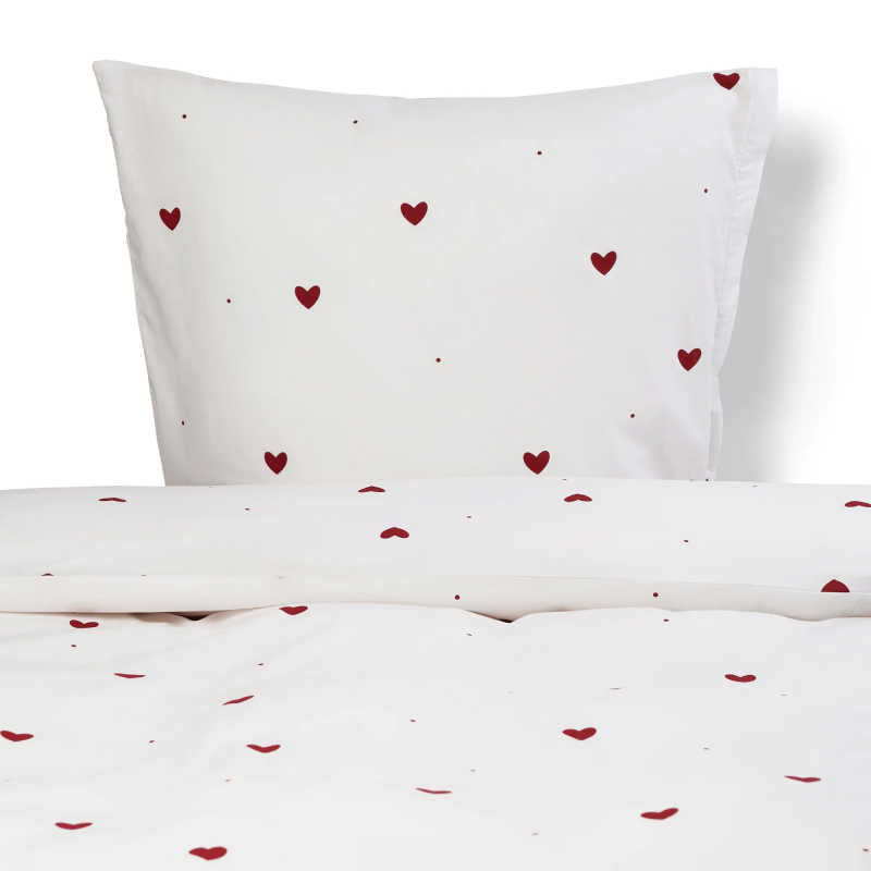 Junior sengetøj 100% bomuld - 100x140 cm - Hvidt sengesæt med fine røde hjerter - Nordstrand Home