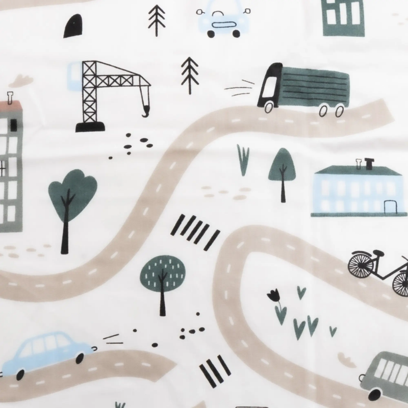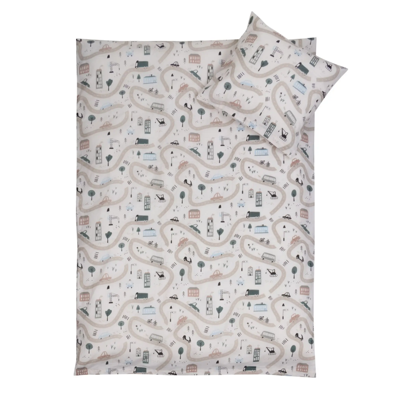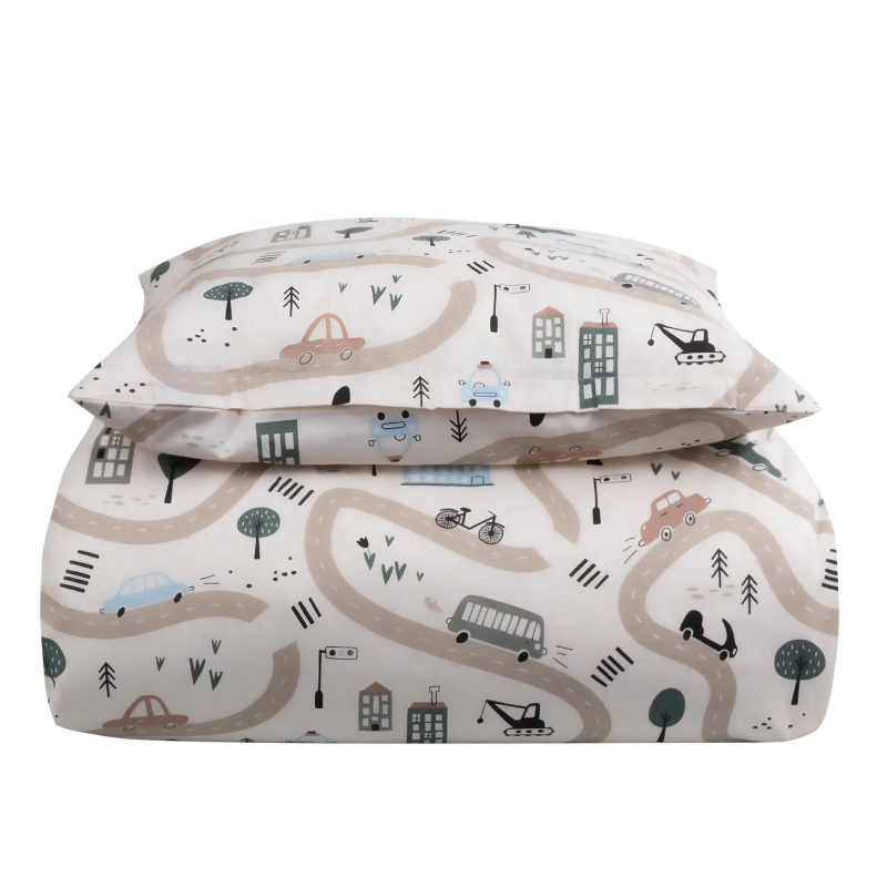 Junior sengesæt med forskellige biler produceret i 100% blød bomuld. Sengetøjet er i en høj kvalitet med god åndbarhed, slidstærk vævning og farveægte - som gør at det vil holde langt bedre på farverne. Det bløde junior sengelinned er perfekt til børn, da materialet er blødt bomuld og OEKO-TEX® certificeret, samt designet er roligt med fine og bløde farver. Sengetøjet er designet med et skønt motiv af biler som kører på en vej blandt nogle huse. At junior sengesættet er OEKO-TEX® certificeret, betyder at det testet fri for skadelige stoffer, så dit barn trygt kan sove med det hver nat.