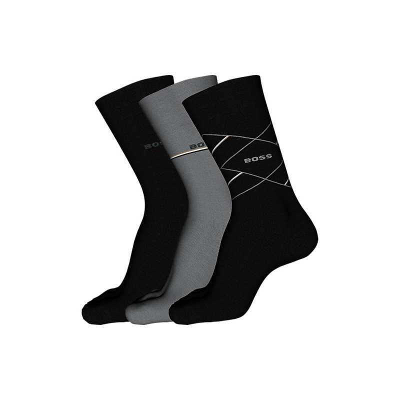 Disse tre par BOSS Menswear-sokker i normal længde har ensfarvede og mønstrede designs, der er et must i hverdagen. Logodetaljer. Rige på bomuld. Dette produkt indeholder mindst 60% bedre råmaterialer. Dette stykke er lavet med mindst 60% bomuld udvundet fra regenerativt landbrug. Regenerativt landbrug prioriterer bevarelse og genopretning af naturlige miljøer med det formål at forbedre biodiversiteten, opretholde vandkvaliteten og forbedre jordens sundhed.