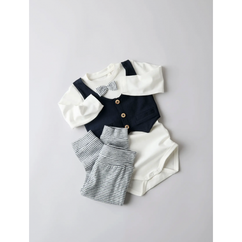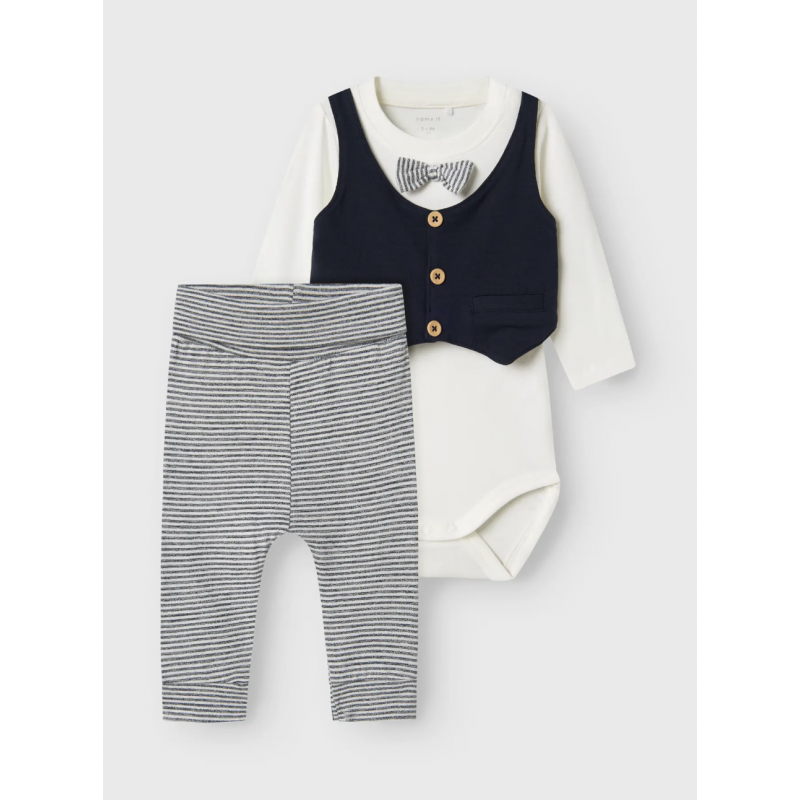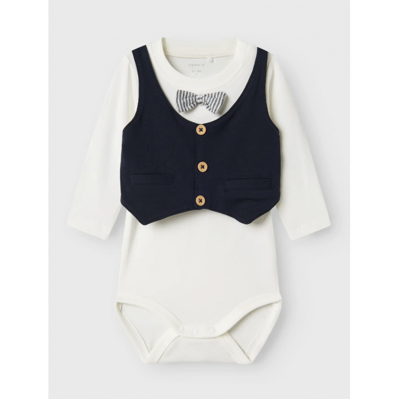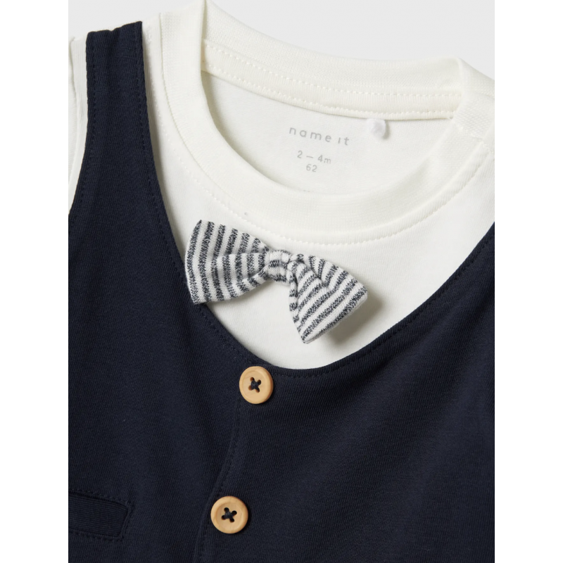 Gør dit barn klar til festlige anledninger med dette Name It body sæt i dark sapphire til drenge. Sættet består af en blød single jersey body og matchende bukser, lavet af 95% økologisk bomuld og 5% elastan, som sikrer komfort og bevægelsesfrihed hele dagen. Bodyen har rund hals, lange ærmer, og sættet har dekorative detaljer som sløjfe og knaplukning for et stilfuldt look. Det lette og stretchy stof giver en behagelig pasform til små aktive drenge, samtidig med at det er blødt mod huden og sikkert for babyer.