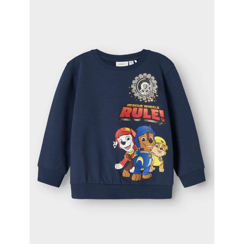 Gør hverdagens leg lidt sjovere med denne Name It “Paw Patrol” sweatshirt i navy (Insignia Blue) til drenge. Sweatshirten er fremstillet i en blød loop back kvalitet af 95% kæmmet bomuld og 5% elastan, der giver både bevægelsesfrihed og høj komfort. Den børstede inderside føles ekstra behagelig mod huden, mens ribkanter ved ærmer, hals og bund sikrer en god og fleksibel pasform. På fronten prydes trøjen af et flot Paw Patrol-motiv med både gummi- og flokprint, som giver en sej 3D-effekt og blød tekstur. Den klassiske rund hals og regular fit gør den ideel til både skole, leg og afslapning. En favorit blandt små fans af de modige redningshunde fra Adventure Bay – perfekt til hverdagens eventyr.