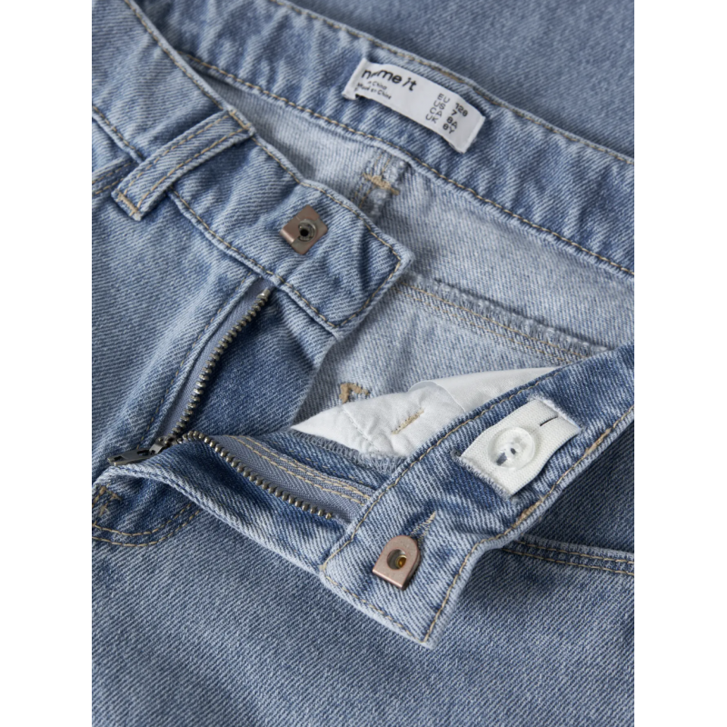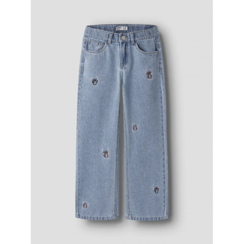 De seje Name it “Stitch” wide leg jeans i lyseblå denim til piger er et must-have i garderoben. Bukserne er fremstillet i slidstærk denim med twill-vævning og består af 80% bomuld og 20% genanvendt bomuld, som sikrer både komfort og holdbarhed. Den vide pasform giver et moderne look og masser af bevægelsesfrihed. Jeansene har justerbar talje, lynlås- og hægtelukning samt flere lommer, og det fine Stitch-broderi tilføjer et legende Disney-touch. Perfekte til både hverdag og særlige anledninger.
