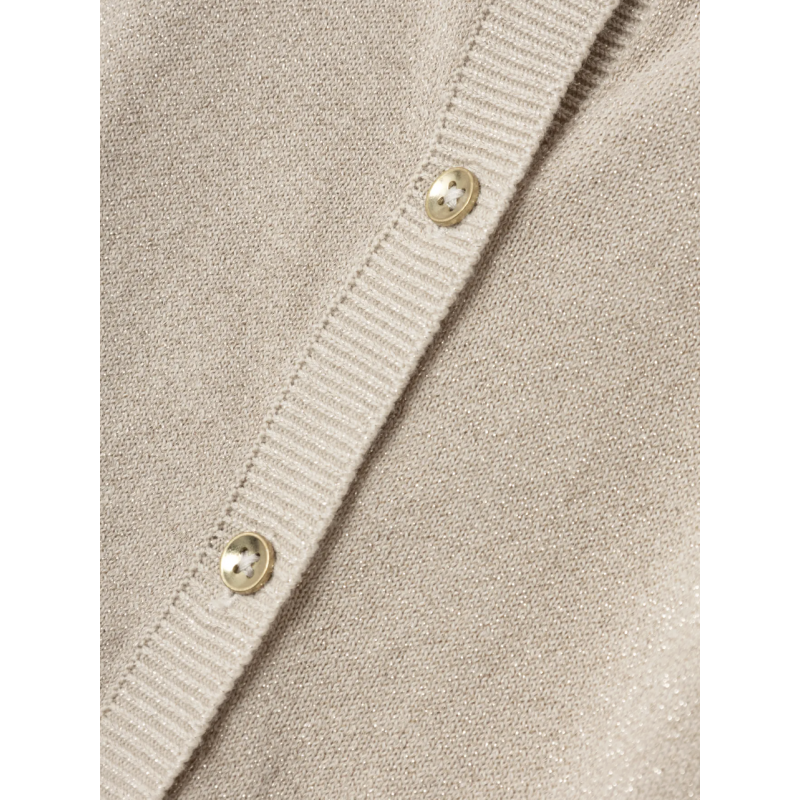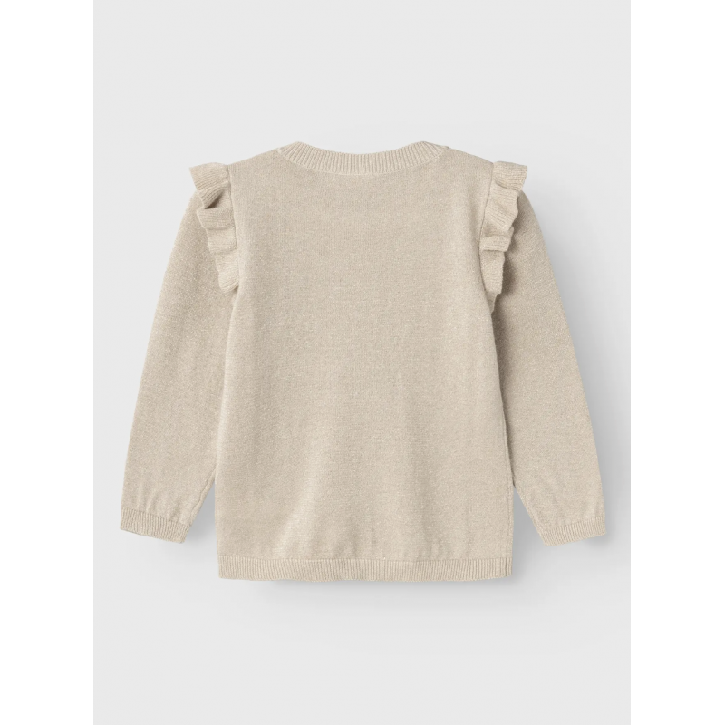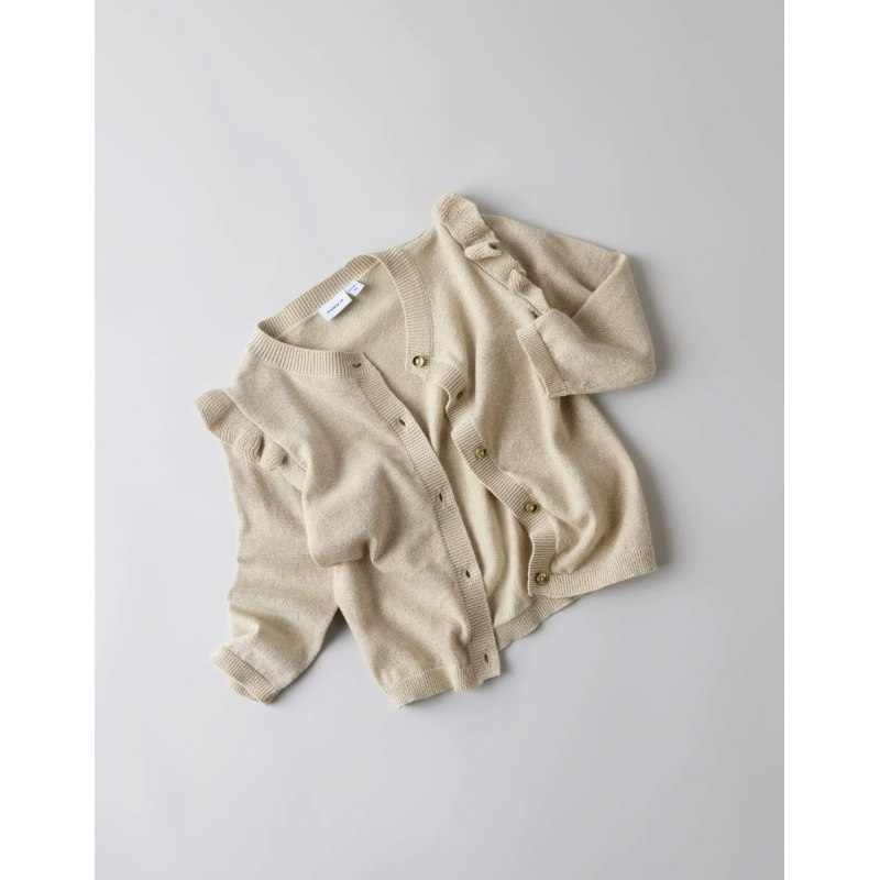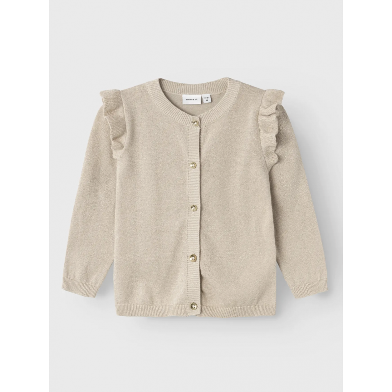 Denne Name it strikcardigan til piger i en elegant beige tone kombinerer komfort og stil. Cardiganen er lavet i blød flat knit med en sammensætning af 74% bomuld, 18% polyester og 8% metallic fibre, der giver et diskret glitrende look. Den har rund hals, lange ærmer med ribkant, knaplukning foran samt dekorative flæsedetaljer, hvilket gør den både praktisk og feminin. Med regular fit er den ideel til lag-på-lag styling over t-shirts, kjoler eller toppe til skole og fritid.
