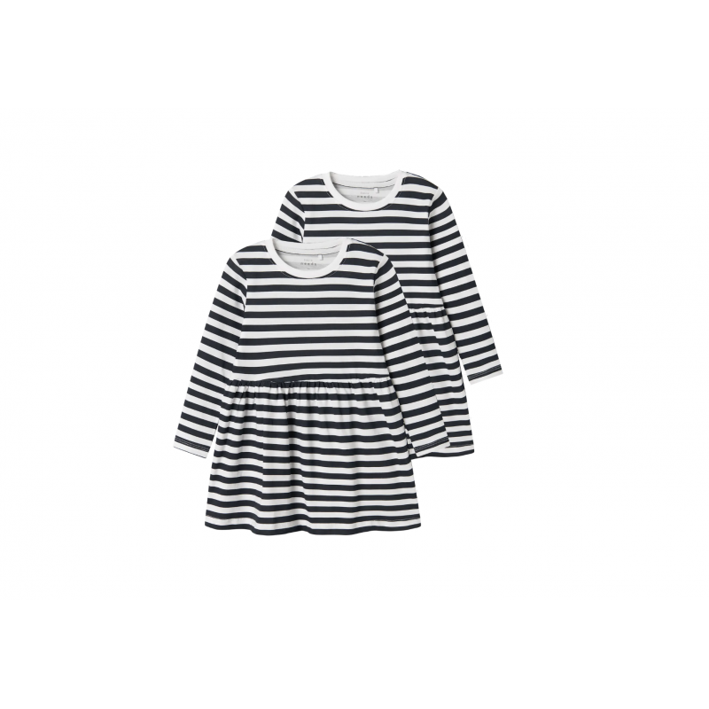 Giv garderoben et løft med denne praktiske og stilfulde 2-pak kjoler fra Name It i farven Dark Sapphire til piger. Sættet indeholder to kjoler i klassisk design – én ensfarvet og én med striber – perfekt til både hverdag og afslappede anledninger. Kjolerne er fremstillet i blød rib circular knit kvalitet af 100% bomuld, som føles behagelig mod huden og giver masser af bevægelsesfrihed. Det lette jerseystof sikrer komfort hele dagen, mens rund hals og lange ærmer giver et tidløst og fleksibelt udtryk. Den regulære pasform gør kjolerne nemme at kombinere med leggings eller strømpebukser for et sødt og funktionelt look. Med dette 2-pak sæt får du både kvalitet, alsidighed og flot design i ét – ideelt til børn, der elsker komfort og stil i hverdagen.