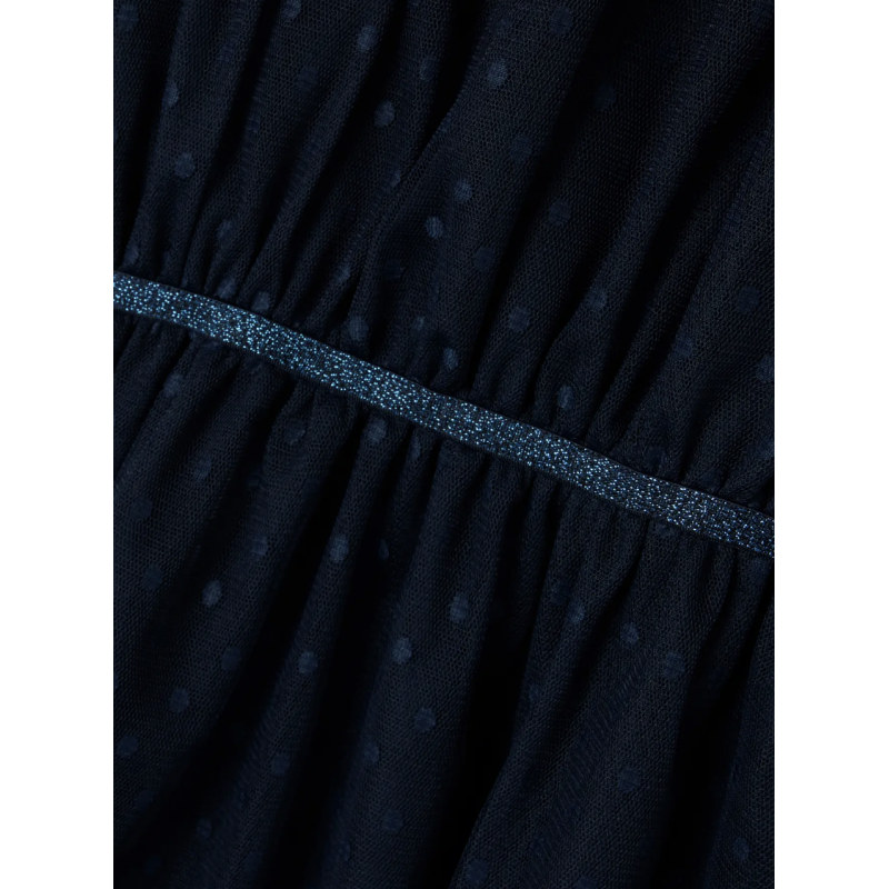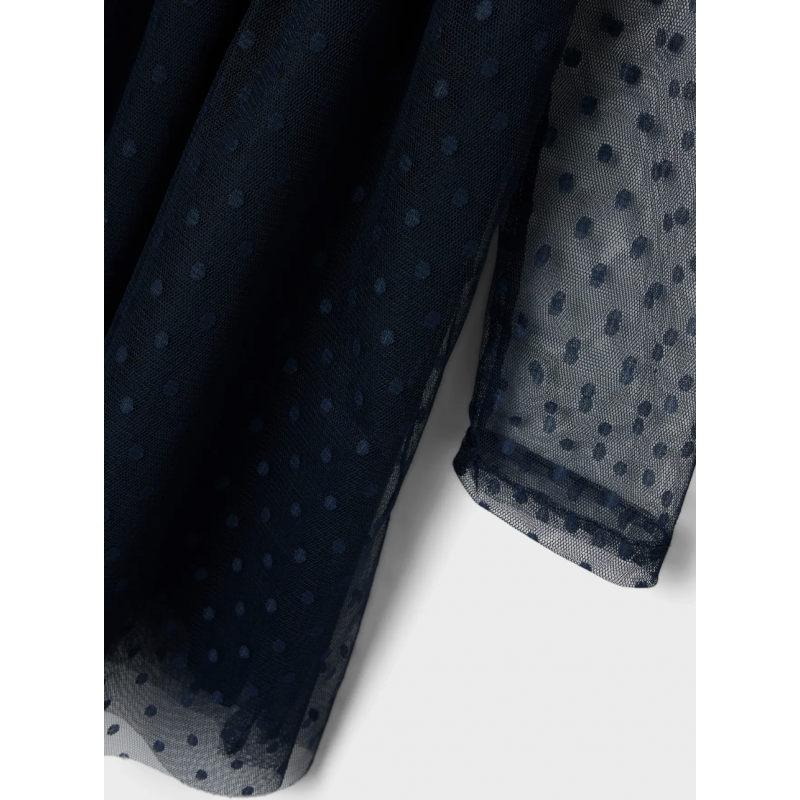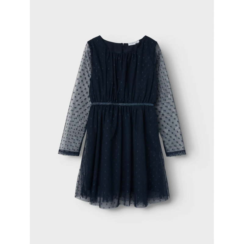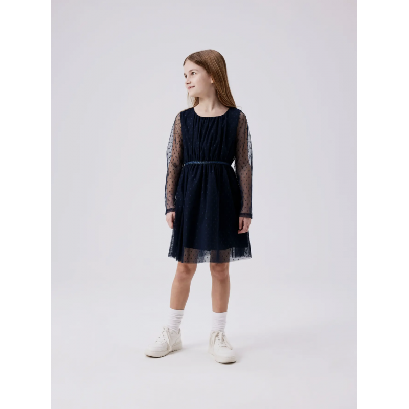 Tilføj elegance og komfort til dit barns garderobe med denne Name It kjole i dark sapphire til piger. Kjolen er lavet af lett tulle-stof i 100% polyester med en netstruktur, som giver et smukt og luftigt look. Den har rund hals, lange ærmer, elastisk talje og en glitrende detalje, der gør kjolen perfekt til festlige lejligheder eller hverdagens finere øjeblikke. Kjolen har polyesterfor, så den ikke er gennemsigtig, og en regular fit, der sikrer bevægelsesfrihed og komfort. En tidløs og charmerende kjole til enhver pige.