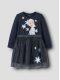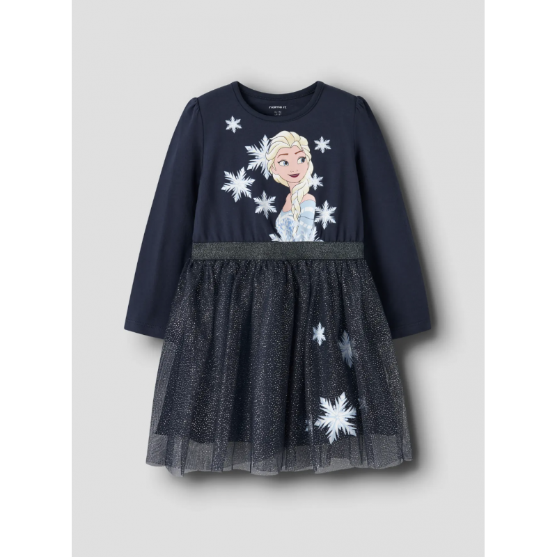 Giv din piges garderobe et magisk touch med Name It "Frozen" Elsa kjolen i navy blazer. Fremstillet i en blød og strækbar single jersey med 66% bomuld, 30% polyester og 4% elastan, sikrer kjolen komfort hele dagen. Den har en rund hals, lange puff-ærmer, elastik i taljen og et soft rubber print, inspireret af Disney’s Frozen. Perfekt til både hverdag og festlige anledninger, hvor komfort og stil kombineres med et strejf af eventyr og magi.