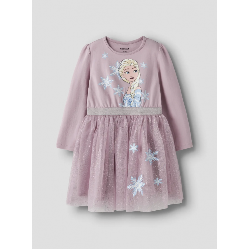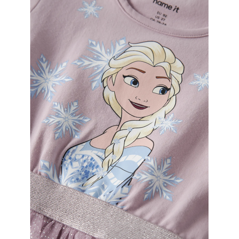 Forkæl din pige med den lyserøde Name It "Frozen" Elsa kjole i farven Keepsake Lilac. Kjolen er fremstillet i 66% bomuld, 30% polyester og 4% elastan i single jersey, hvilket giver en blød, let og strækbar pasform. Den har en rund hals, lange puff-ærmer, elastik i taljen og et soft-touch rubber print inspireret af Disney’s Frozen. Perfekt til leg, skole eller særlige begivenheder, hvor komfort, stil og magisk inspiration fra Elsa går hånd i hånd. En kjole, der kombinerer hverdagskomfort med Disney-magi.