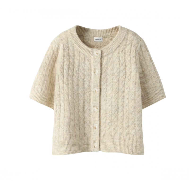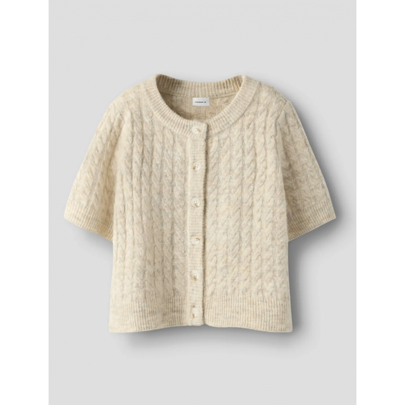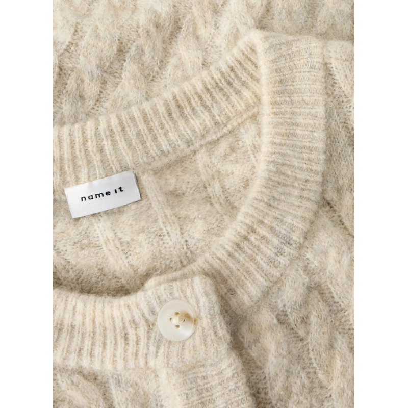 Denne Name it strikcardigan til piger er perfekt til kølige dage og hyggelige aftener. Cardiganen er fremstillet i flat knit, som giver et klassisk og tidløst udtryk med en blød og behagelig kvalitet. Den har rund hals, lange ærmer og knaplukning, der gør den nem at tage af og på. Den løse pasform sikrer god bevægelsesfrihed og ekstra komfort i hverdagen. En alsidig cardigan, der nemt kan styles over kjoler, bluser eller T-shirts og passer både til skole og fritid.