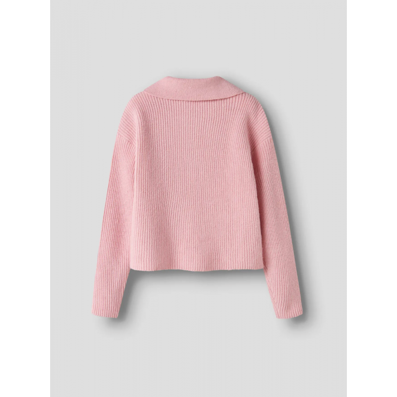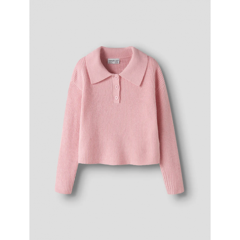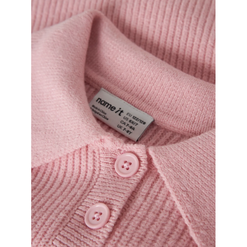 Denne Name it langærmede strikpolo til piger kombinerer komfort og et tidløst design, der er ideelt til kølige dage. Den er fremstillet i flat knit, som giver et rent og klassisk udtryk samt en blød fornemmelse mod huden. Strikpoloen har polokrave med knaplukning, lange ærmer og en løs pasform, der sikrer god bevægelsesfrihed og høj komfort. Den smukke lyserøde farve Winsome Orchid gør den nem at style til både hverdag og mere pæne anledninger – perfekt sammen med jeans, leggings eller nederdel.
