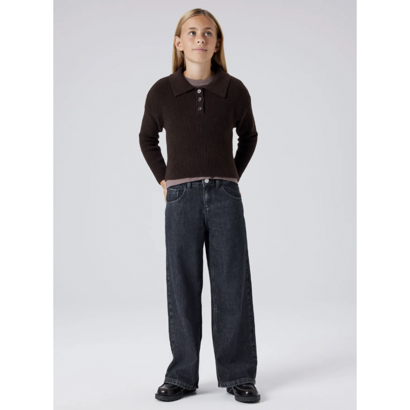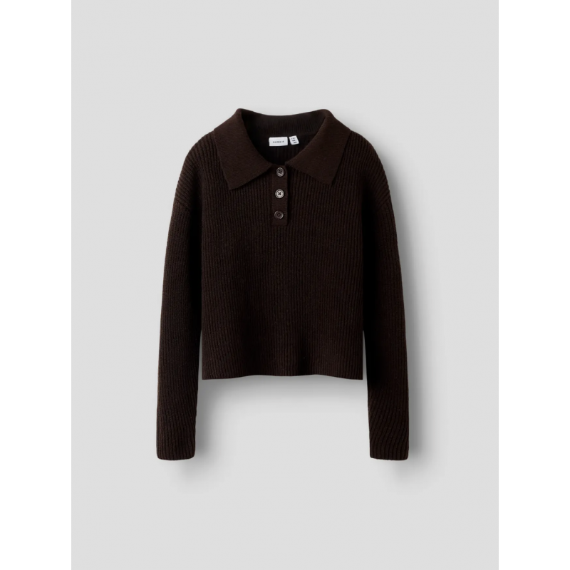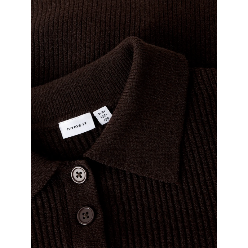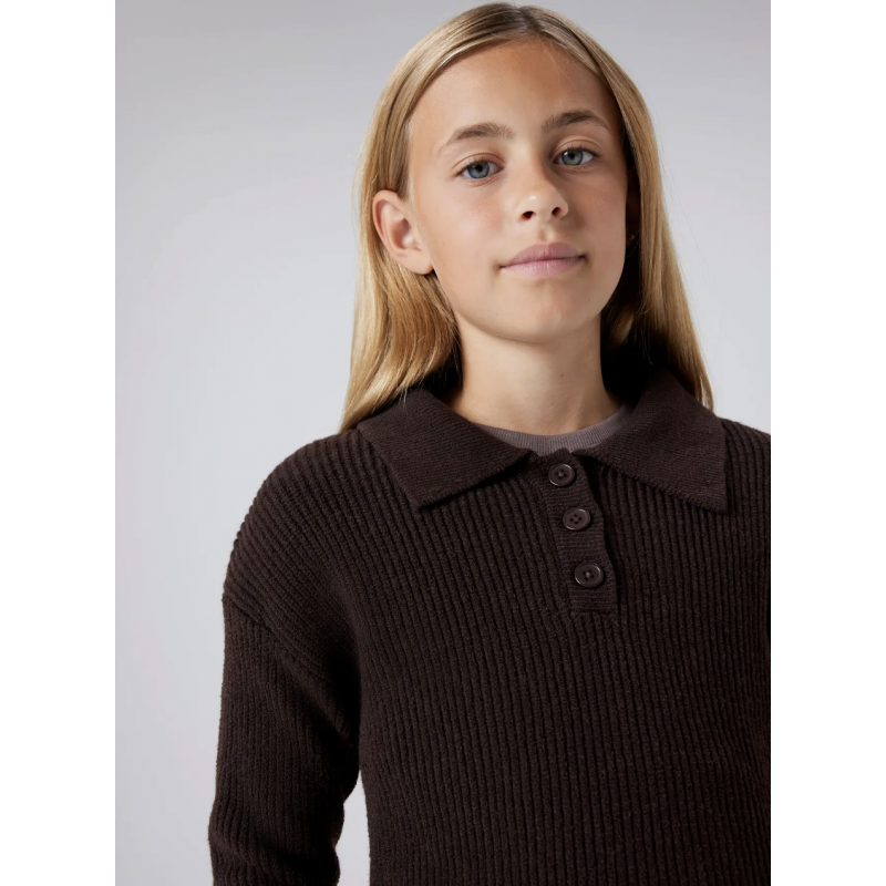 Denne Name it langærmede strikpolo til piger kombinerer komfort og et tidløst design, der er ideelt til kølige dage. Den er fremstillet i flat knit, som giver et rent og klassisk udtryk samt en blød fornemmelse mod huden. Strikpoloen har polokrave med knaplukning, lange ærmer og en løs pasform, der sikrer god bevægelsesfrihed og høj komfort. Den smukke brune farve Mole gør den nem at style til både hverdag og mere pæne anledninger – perfekt sammen med jeans, leggings eller nederdel.