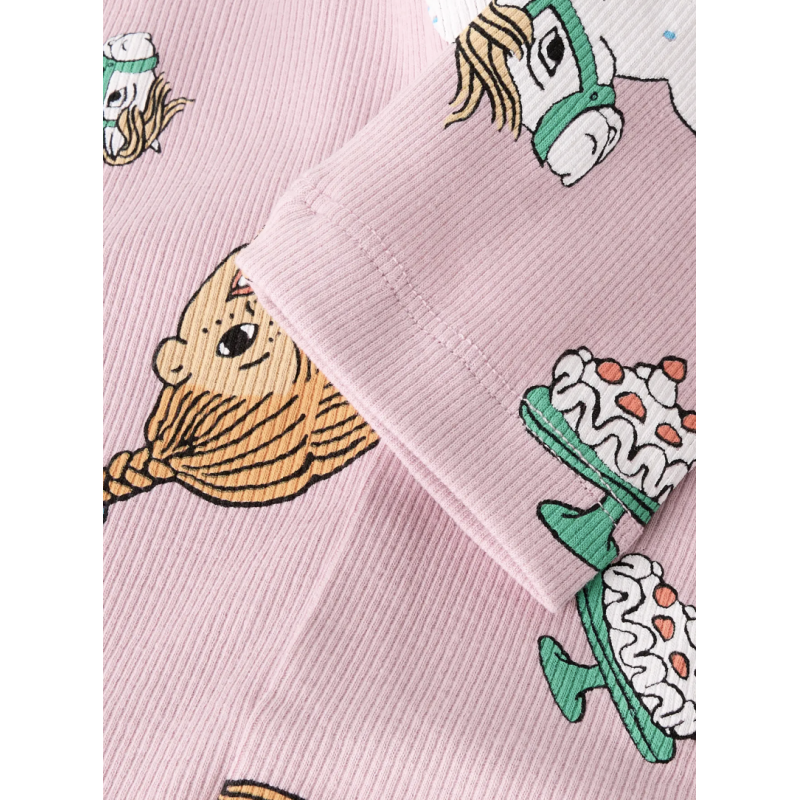 Den ribstrikkede kvalitet med lodrette striber giver et tidløst look og god elasticitet, så leggingsene sidder behageligt hele dagen. Den elastiske talje gør dem nemme at tage af og på, mens det gennemgående print tilfører et sjovt og genkendeligt design, som børn elsker.