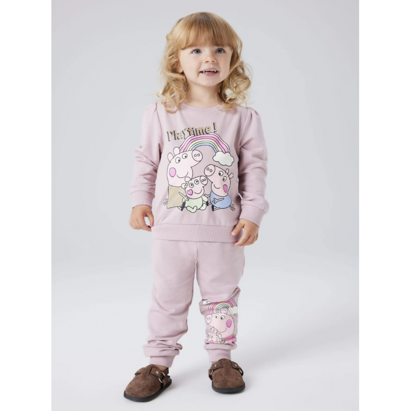 Hold din pige både komfortabel og stilfuld med Name It "Gurli gris" lyserøde sweatpants. Disse trendy bukser er fremstillet i blød loop-back bomuldsblanding (95% bomuld, 5% elastan), som sikrer en behagelig pasform hele dagen. Med elastisk og justerbar talje samt ribkanter ved anklerne giver de både bevægelsesfrihed og et moderne look. Det sjove Peppa Pig-print tilføjer et legende og genkendeligt motiv, der vil glæde små fans. Perfekte til hverdagsbrug, leg og afslapning derhjemme.