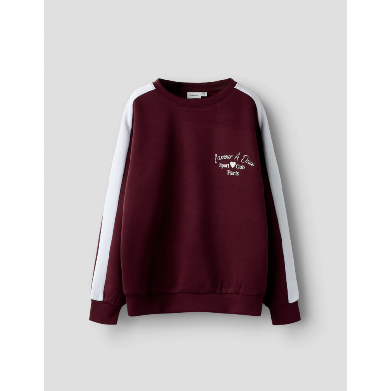 Tilføj komfort og stil til børnegarderoben med denne Name It sweatshirt i rød (burgundy) til piger. Sweatshirten er fremstillet i blød loop back kvalitet bestående af 48% polyester, 48% viscose og 4% elastan, hvilket sikrer en behagelig og fleksibel pasform. Stoffets glatte yderside og de bløde løkker på indersiden gør sweatshirten behagelig at have på hele dagen, mens ribkanter i ærmer og bund giver god pasform og holdbarhed. Den klassiske rund hals og lange ærmer gør modellen tidløs og nem at kombinere med både bukser, leggings og nederdele. En diskret pigmentprint tilføjer et blødt visuelt udtryk uden at gå på kompromis med designet. Den regelmæssige pasform giver bevægelsesfrihed, hvilket gør sweatshirten perfekt til skole, leg eller afslappede dage. Name It leverer her en slidstærk, moderne og behagelig sweatshirt i høj kvalitet til aktive piger.