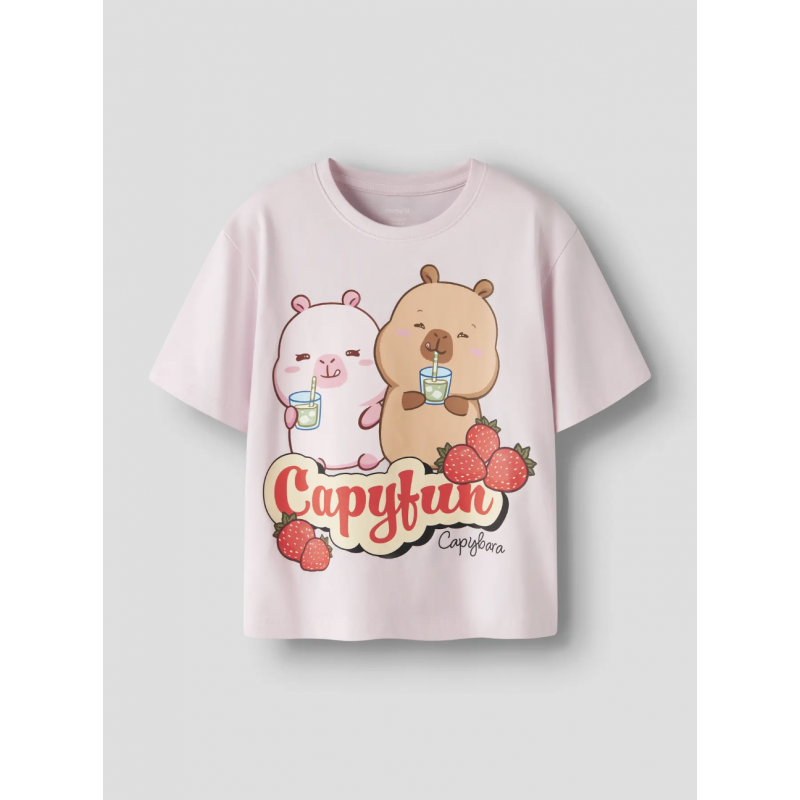 Opgrader din piges garderobe med den lyserøde Name It "Capybara" T-shirt. Denne t-shirt er fremstillet i 95% bomuld og 5% elastan i single jersey, hvilket sikrer en blød, let og strækbar pasform. Den har en rund hals, korte ærmer og et rubber print, der føles blødt mod huden. Inspireret af den venlige Capybara, bringer t-shirten ro og glæde til hverdagen. Perfekt til både leg, skole og afslapning, hvor komfort og stil kombineres i ét design.