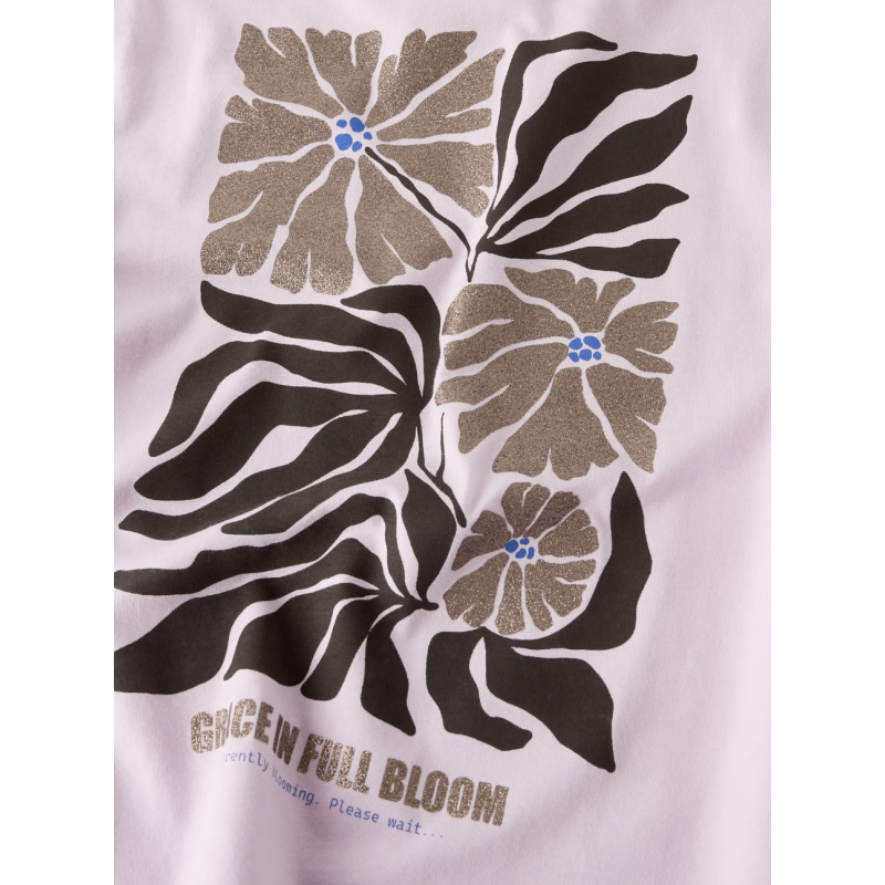 T-shirten har rund hals, korte ærmer og en regulær pasform, der gør den nem at style med bukser, nederdele eller leggings. Det flotte glitterprint giver et sprudlende og iøjnefaldende look, mens det diskrete pigmentprint sikrer blødhed og komfort mod huden. Lyserød farve i Winsome Orchid tilfører et feminint og trendy touch, som hurtigt bliver en favorit i garderoben.