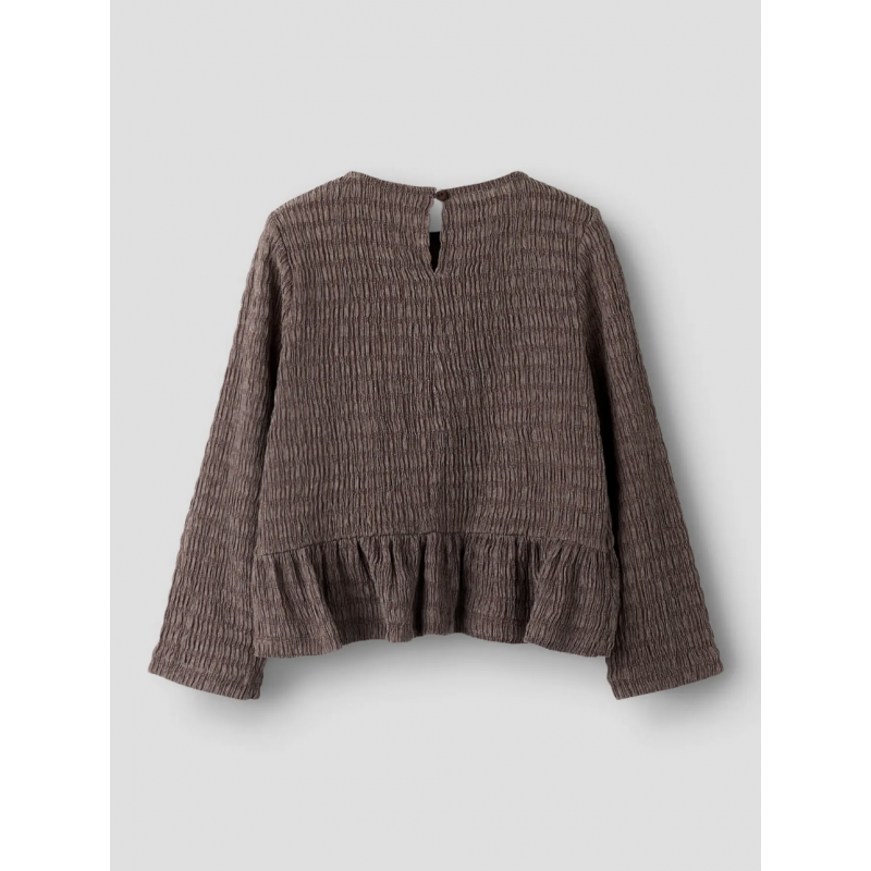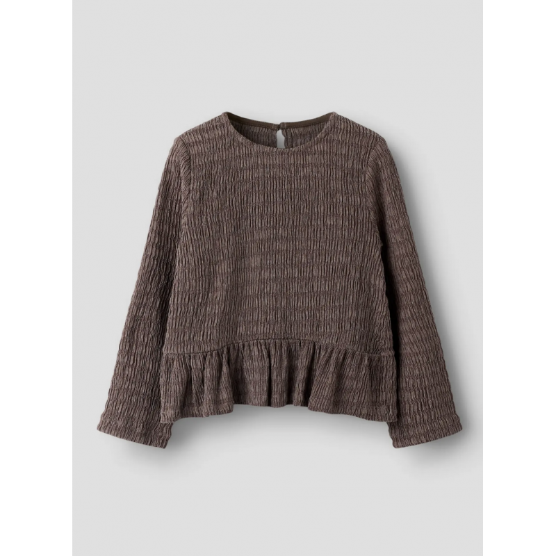 Opgrader pigens garderobe med denne Name it langærmede top i brun. Fremstillet i let og holdbart crinkle-vævet stofmed et subtilt krydsmønster, der giver en moderne tekstur og klassisk elegance. Toppen har runde ærmer og rund hals, peplum-detalje og knap- og stroplukning bagpå, hvilket tilføjer et feminint touch. Med regular fit sidder toppen behageligt og naturligt. Perfekt til både hverdag og særlige anledning.