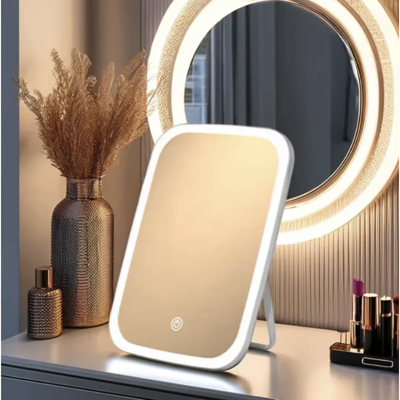 THE SQUARE er et firkantet bordspejl med LED-lys på praktisk stativ. Perfekt til makeup, grooming og daglig styling. Elegant hvid/guld-design giver et luksuriøst touch til dit bord eller vanity.